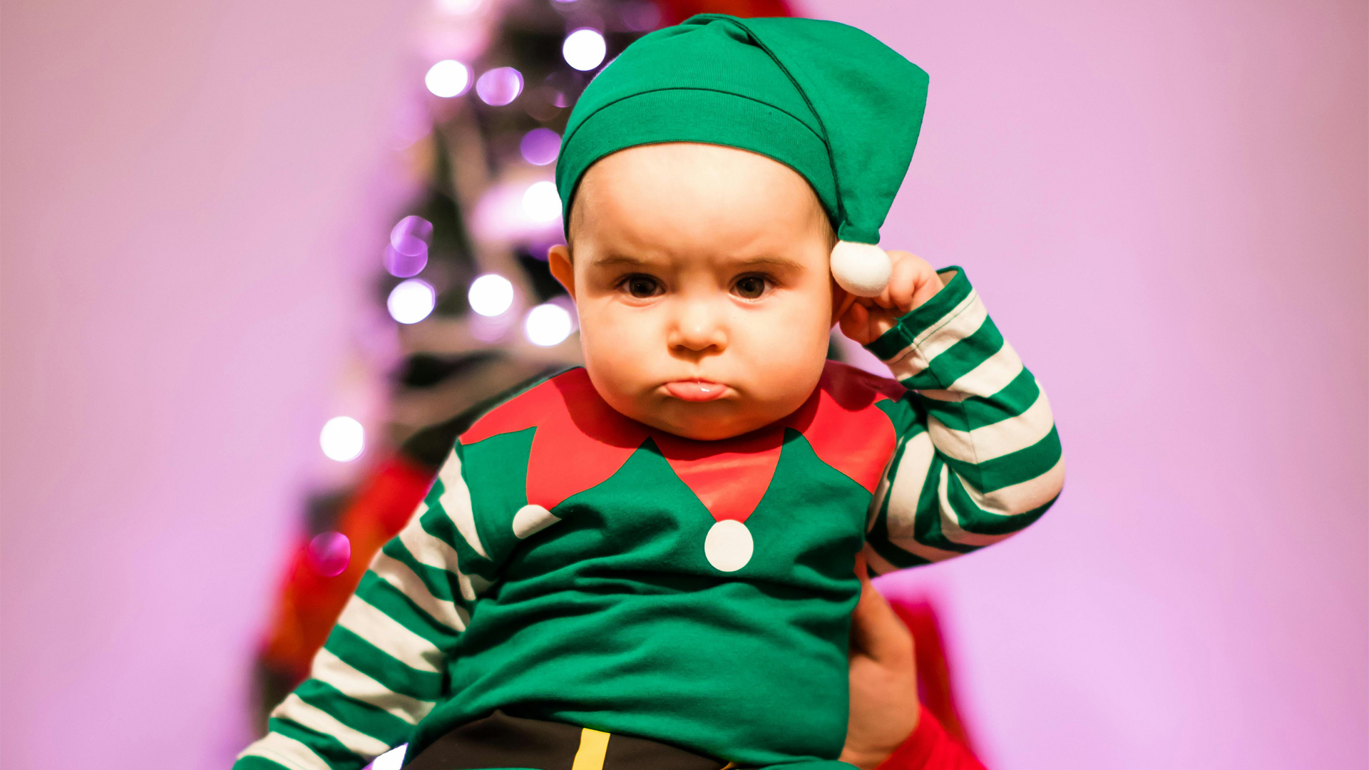 Holiday-themed baby with a focused expression, symbolizing responsibility and mental load during a busy season.